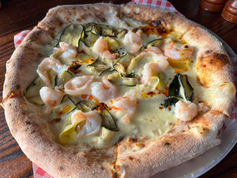 Prawn pizza at Beach Club Watsons Bay